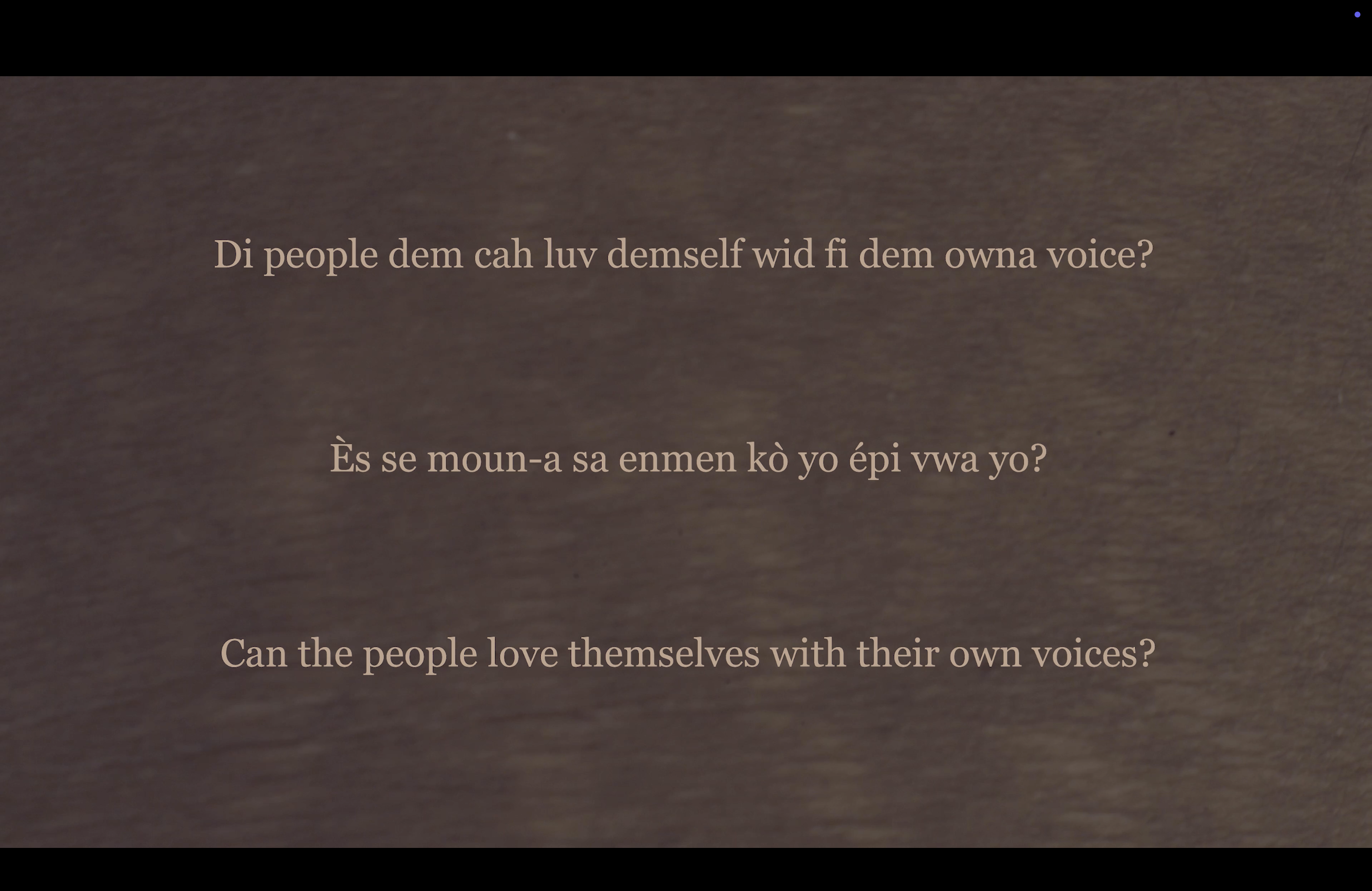 three translations of the questions. Patois is positioned at the top of the screen, Kwéyòl in the center, and Standard American English (U.S.) at the bottom. The duration each question remains on the screen varies, getting longer as the video goes on. At certain points, it can become hard to see the text against reflections on the skin and the viewer may have to wait for the text to become